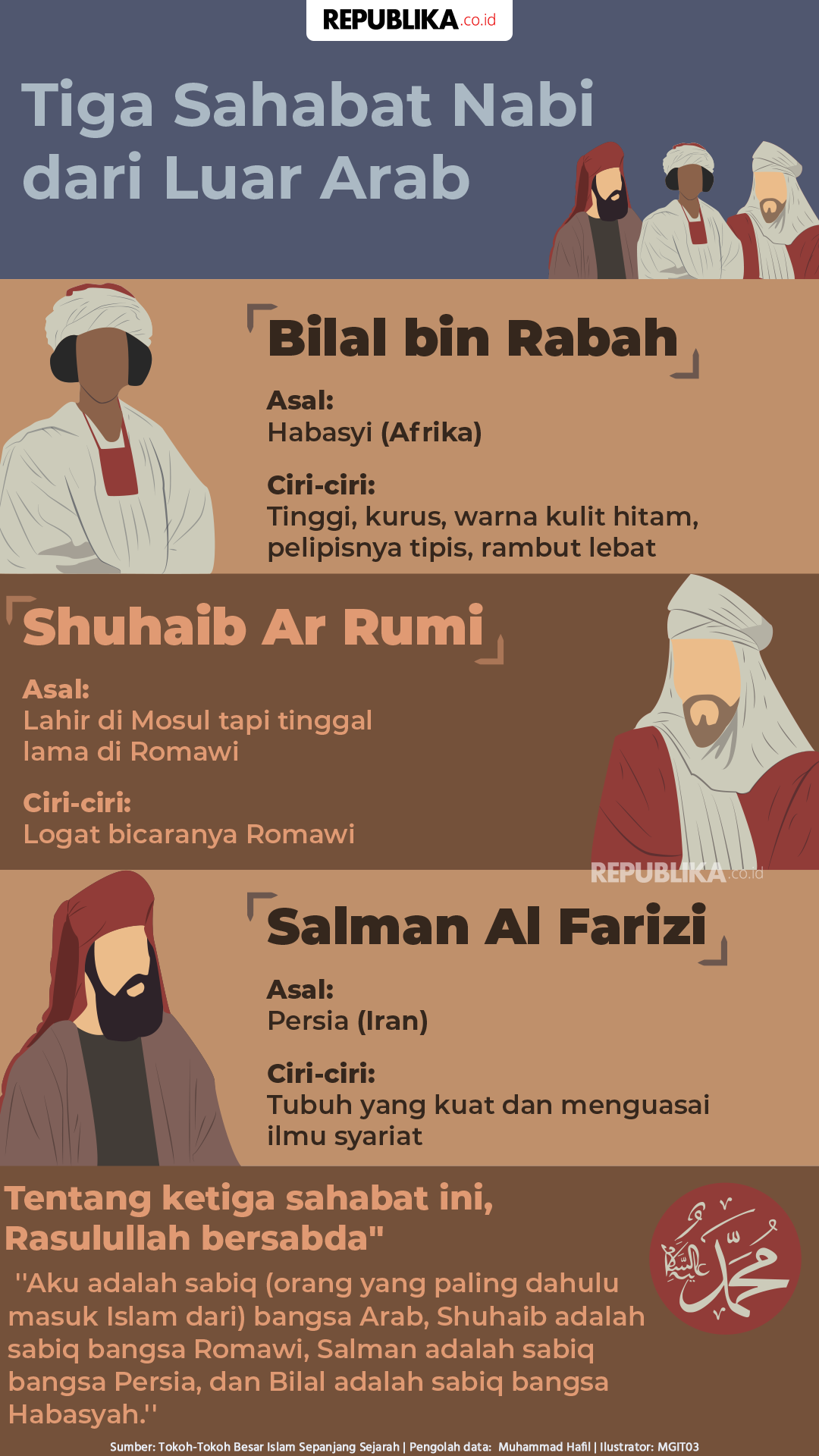 Bilal bin Rabah: Seorang budak berkulit hitam yang disiksa karena memeluk Islam. Ia kemudian dibebaskan oleh Abu Bakar dan menjadi muazin pertama dalam Islam.