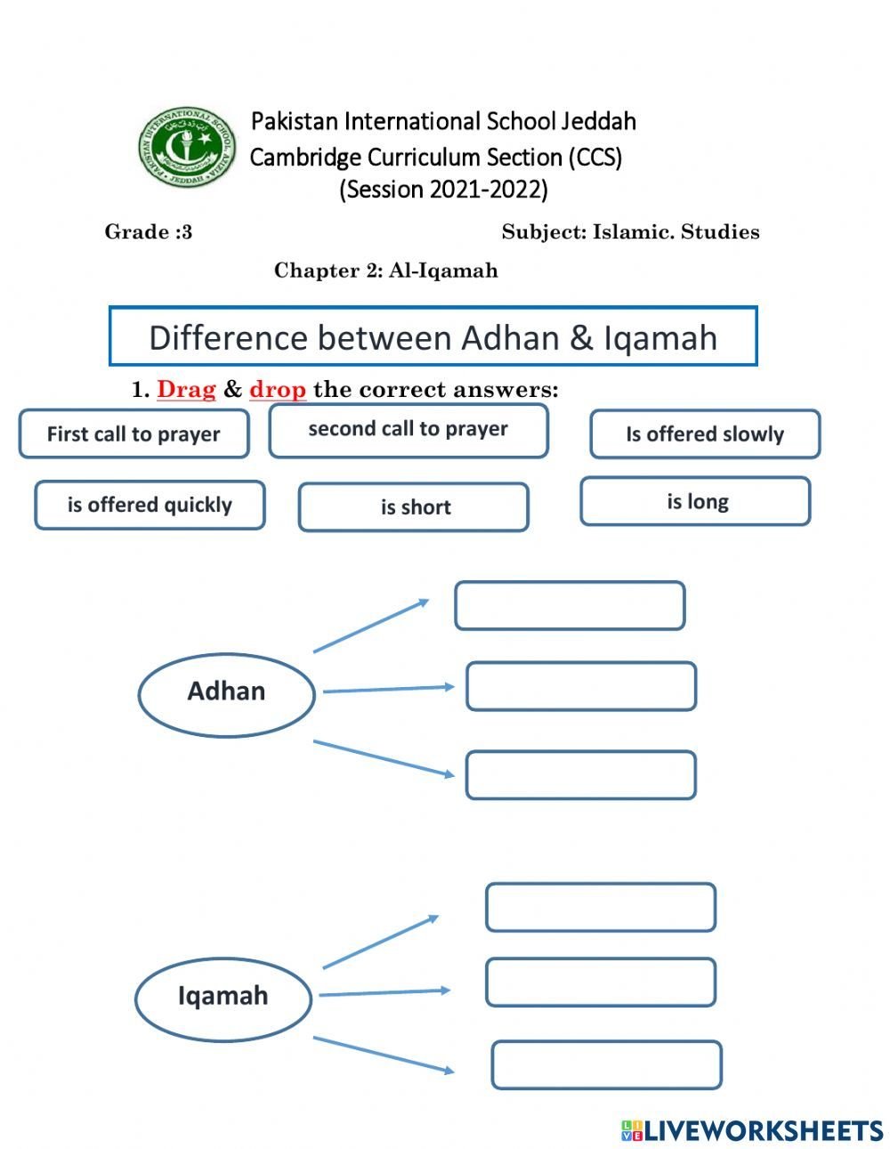 Meskipun keduanya merupakan panggilan untuk shalat, adzan dan iqamah memiliki perbedaan mendasar. Adzan dikumandangkan dari tempat yang tinggi, seperti menara masjid, dengan suara yang lantang agar dapat didengar oleh seluruh masyarakat. Tujuannya adalah untuk memberitahukan masuknya waktu shalat dan mengajak kaum Muslimin untuk segera menunaikannya.