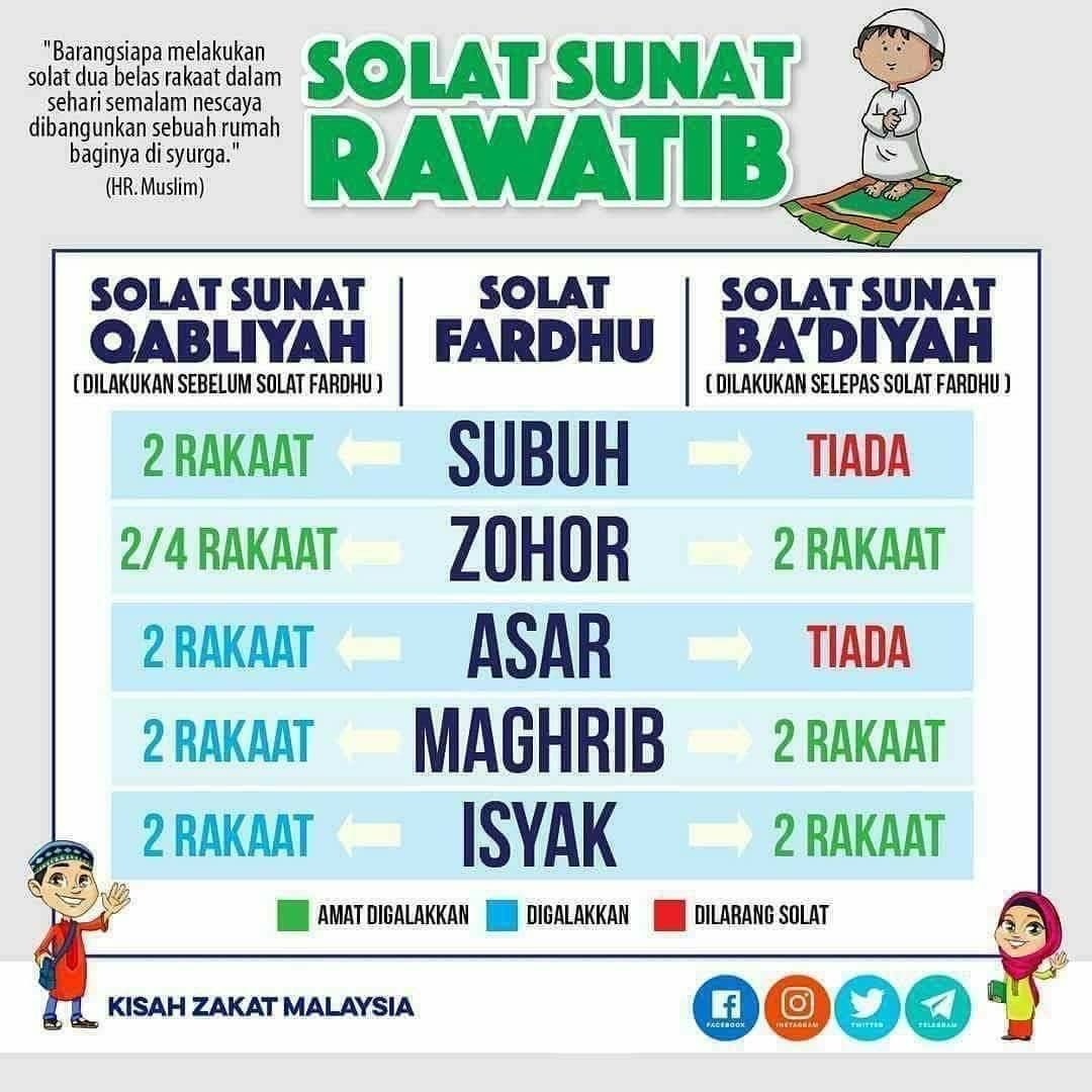 Shalat Sunnah Rawatib: Shalat sunnah rawatib adalah shalat sunnah yang mengiringi shalat fardhu. Shalat sunnah rawatib terbagi menjadi dua, yaitu: