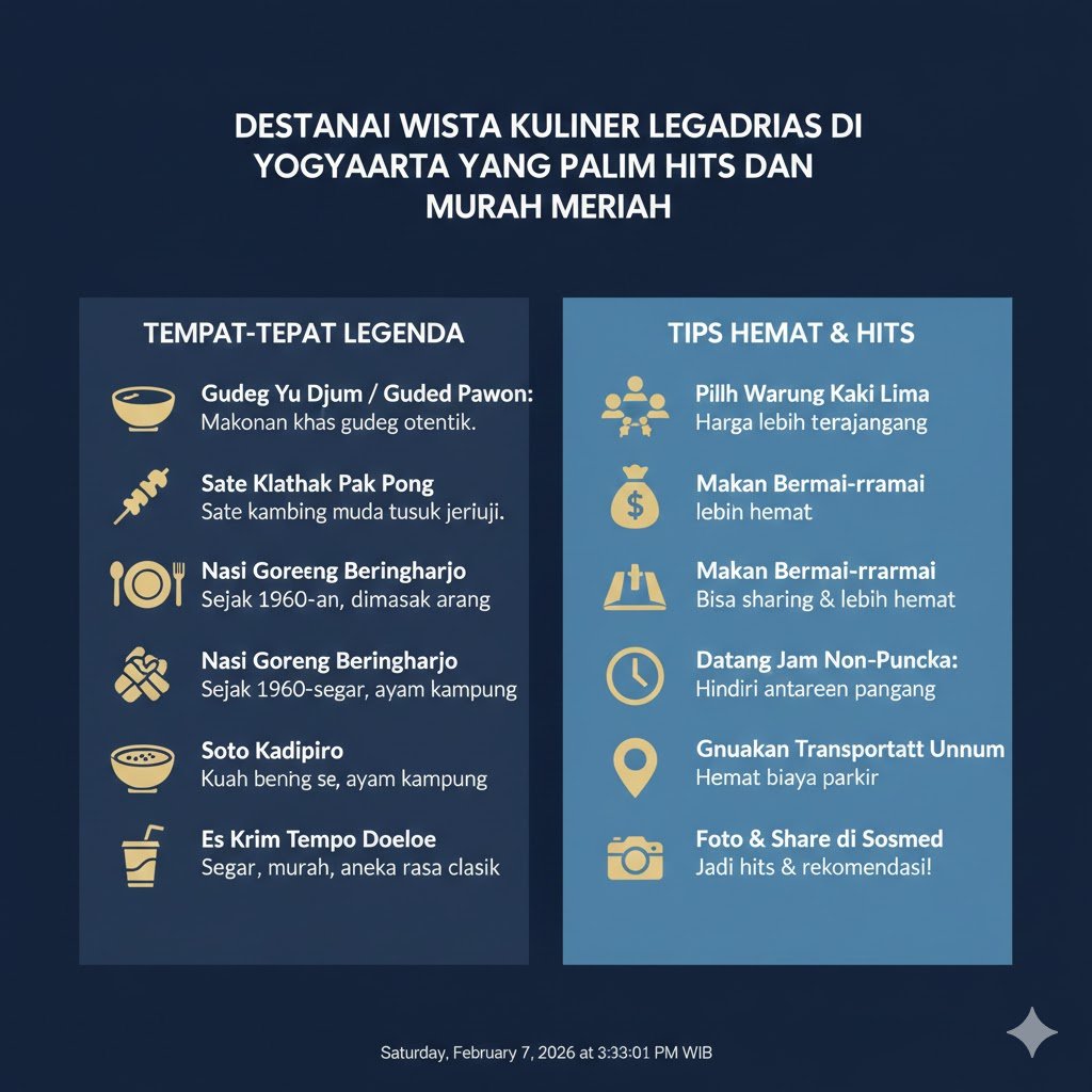 Yogyakarta bukan sekadar kota budaya dengan candi dan keraton yang megah. Bagi para pelancong, kota ini adalah surga rasa yang menawarkan kenikmatan kuliner tanpa harus menguras kantong. Menjelajahi sudut-sudut Jogja akan membawa Anda pada deretan warung makan legendaris yang sudah bertahan puluhan tahun namun tetap menjadi primadona hingga saat ini. Keunikan bumbu tradisional dan atmosfer kota yang hangat membuat setiap suapan terasa begitu berkesan.